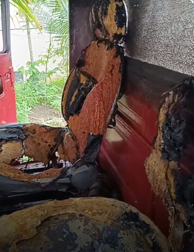 പെട്രോൾ ഒഴിച്ചു കത്തിച്ച ലോറിയുടെ മുന്നിലെ ക്യാബിൻ പൂർണ്ണമായും കത്തി നശിച്ച അവസ്ഥയാണ് .