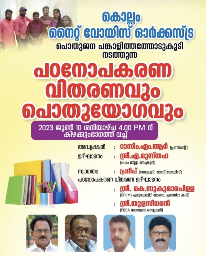 ചിതറ : ചിതറ കിഴക്കുംഭാഗത്ത് വച്ച് ജൂൺ 10 ശനിയാഴ്ച വൈകിട്ട് നാല് മണിക്ക് . കൊല്ലം നൈറ്റ് വോയ്സ് ഓർക്കസ്ട്ര പൊതുജന പങ്കാളിത്തത്തോടുകൂടി പഠനോപകരണ വിതരണം നടത്തുകയാണ് .