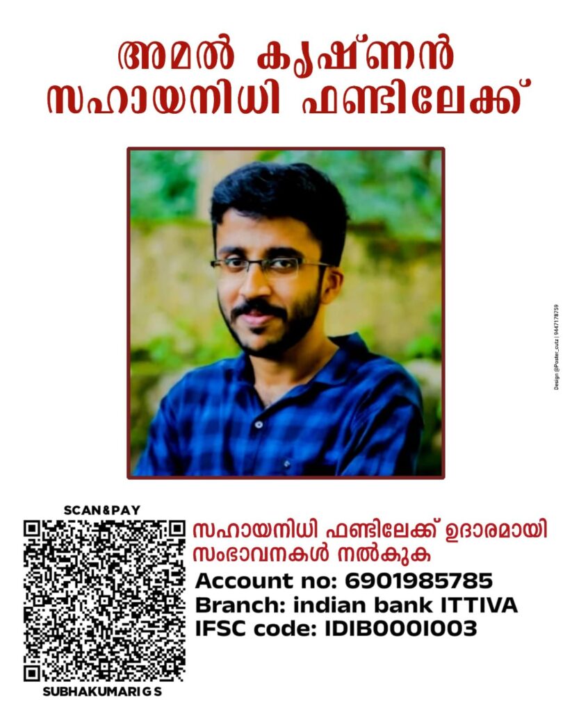 കോട്ടുക്കൽ സ്വദേശിയായ അമൽ കൃഷ്ണൻ ഇന്നൊരു ജീവൻ മരണ പോരാട്ടത്തിലാണ് 25 വയസ്സ് മാത്രം പ്രായമുള്ളഈ കുഞ്ഞ് അനുജനെ ജീവിതത്തിലേക്ക് തിരിച്ചുകൊണ്ടുവരണം തലച്ചോറിന്റെ അടിഭാഗത്ത് ഉണ്ടാകുന്ന അപൂർവ്വവും ഗുരുതരവുമായ ഒരു ട്യൂമറാണ് അമ്മലിനെ ബാധിച്ചിരിക്കുന്നത് തിരുവനന്തപുരം കിംസ് ആശുപത്രിയിൽ 5 ലക്ഷം രൂപയിലെറേ ചിലവിട്ട് അടിയന്തര ശസ്ത്രക്രിയ ചെയ്തു. ഈ രോഗത്തിന് തുടർ ചികിത്സ കേരളത്തിൽ ലഭ്യമല്ല. അതിനാൽ മുംബൈയിലെ ടാറ്റ മെമ്മോറിയൽ ഹോസ്പിറ്റലിൽലാണ് ഇപ്പോൾ ചികിത്സ. ചിലവേറിയ പ്രോട്ടോൺ റേഡിയേഷൻ ചികിത്സയാണ് ഇനി ആവശ്യം അതിന് ഏകദേശം 15 ലക്ഷം രൂപ ചിലവ് വരും . അതിനാൽ നമ്മുടെ നാട്ടിലെ ജാതിമത രാഷ്ട്രീയ വ്യത്യാസമില്ലാതെ എല്ലാവരും കഴിയുന്ന സഹായം കൈമാറണം നമ്മുടെ ഈ കുഞ്ഞു സഹോദരനെ ജീവിതത്തിലേക്ക് തിരിച്ചുകൊണ്ടുവരണം അതിനായി നന്മുടെ നാട് തയ്യാറായി നിൽക്കുകയാണ്. ഇതിന് വേണ്ടി എല്ലവരും . സഹകരിക്കണമെന്ന് അപേക്ഷിക്കുന്നു.🙏